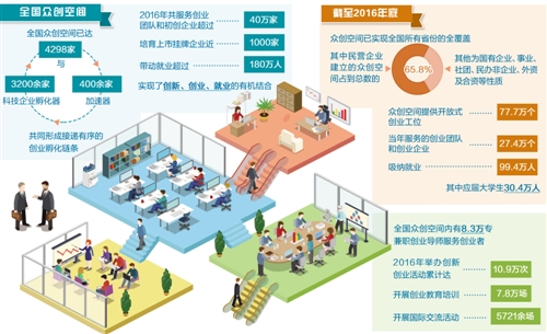 眾創(chuàng)空間順應(yīng)互聯(lián)網(wǎng)時(shí)代創(chuàng)新創(chuàng)業(yè)勢(shì)頭而生,成為搭載市場(chǎng)化機(jī)制、專(zhuān)業(yè)化服務(wù)和資本化途徑,為創(chuàng)業(yè)者籌謀的新型創(chuàng)業(yè)服務(wù)平臺(tái)。科技部火炬中心提供的數(shù)據(jù)顯示,兩年來(lái),全國(guó)眾創(chuàng)空間已達(dá)4298家,與3200余家科技企業(yè)孵化器和400余家加速器共同形成接遞有序的創(chuàng)業(yè)孵化鏈條,2016年共服務(wù)創(chuàng)業(yè)團(tuán)隊(duì)和初創(chuàng)企業(yè)超過(guò)40萬(wàn)家,培育上市掛牌企業(yè)近1000家,帶動(dòng)就業(yè)超過(guò)180萬(wàn)人,實(shí)現(xiàn)了創(chuàng)新、創(chuàng)業(yè)、就業(yè)的有機(jī)結(jié)合與良性循環(huán)。